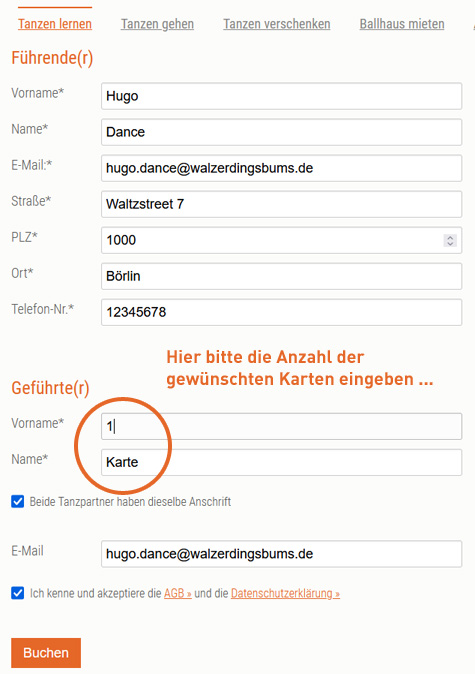 Möchtest Du nur 1 oder mehrere Eintrittskarten erwerben, so mache Deine Angaben bei Geführte(r) bitte so: